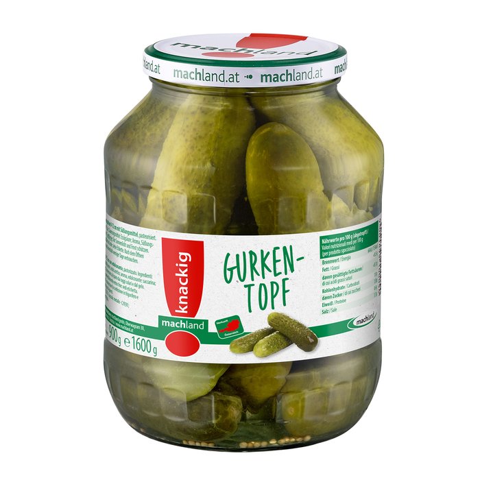 Zutaten: Gurken, Salz, Säuerungsmittel: Essigsäure, Aroma, Süßungsmittel: Saccharin, SENFKÖRNER