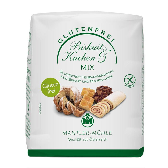 Mit dem Biskuit und Kuchenmix von Mantler lassen sich glutenfreie Rührkuchen und Biskuitteige herstellen. Das Mehl basiert auf Kartoffel-, Mais- und Reisstärke.
