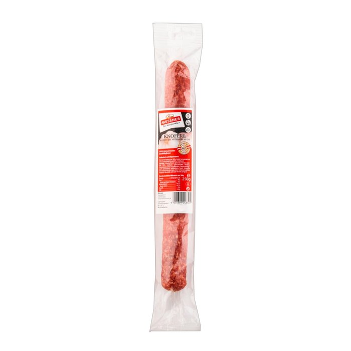 Intensiv aromatisch und herzhaft im Geschmack ist das Knoferl von Messner. Die geräucherte Hartwurst ist luftgetrocknet und ein köstliches Jausenschmankerl.