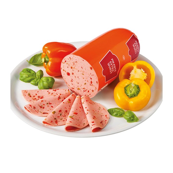 Aus der Feinkosttheke frisch auf den Tisch kommt die Pikantwurst von Messner. Das farbenfrohe Paprikagemüse macht sie zum optischen Hingucker beim Abendessen.