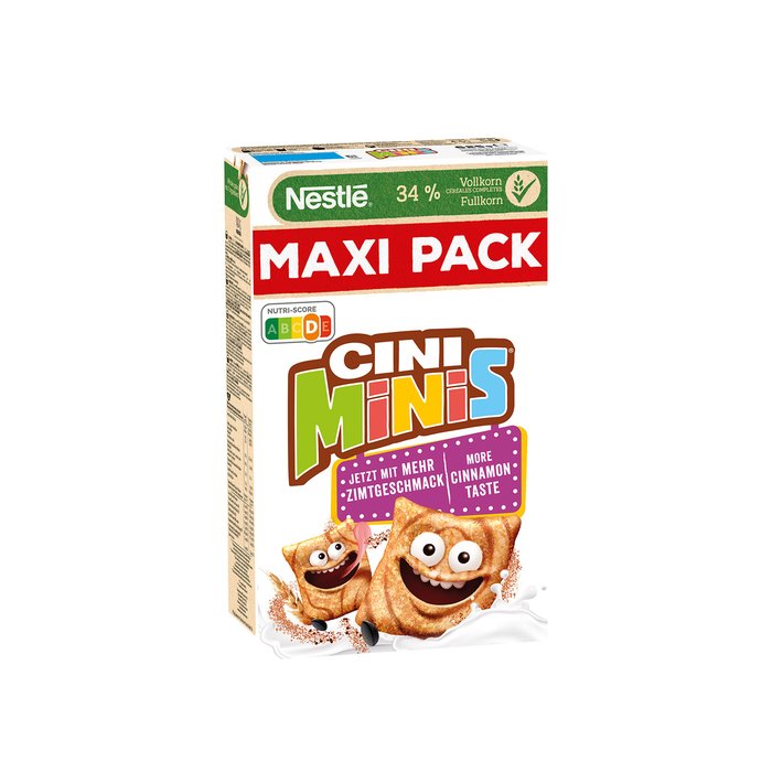 Nestlé Cini Minis im Maxi-Pack sind knusprige Frühstückscerealien mit hohem Vollkornanteil. Die kleinen Knusperstücke sind mit Zimtgeschmack verfeinert.