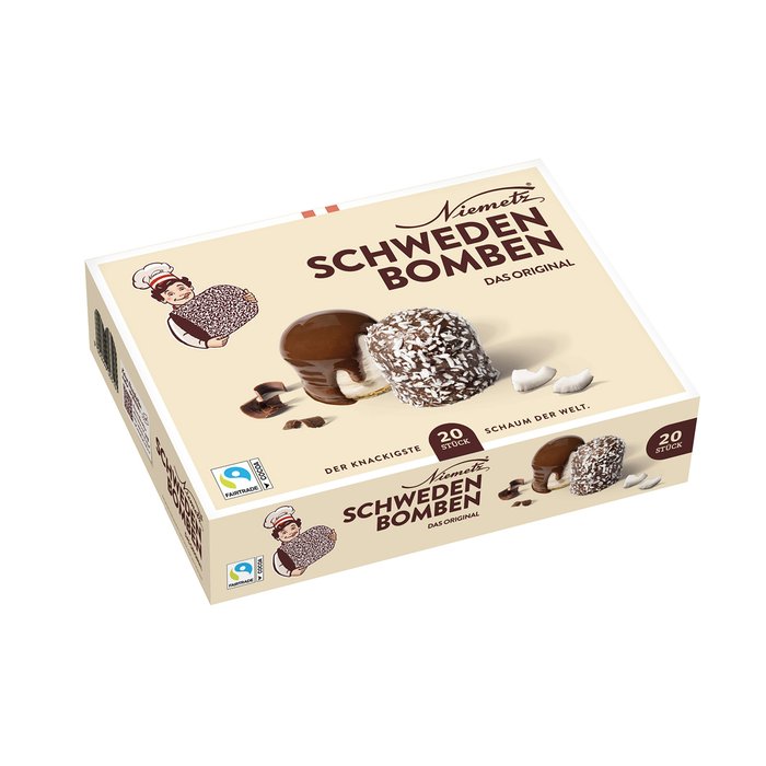 Zutaten: Zucker, HÜHNEREIWEIß, Palmkernfett ganz gehärtet, Glukosesirup, Trinkwasser, fettarmes Kakaopulver, Kokosraspeln, WEIZENMEHL, Kokosnussfett ganz gehärtet, MAGERMILCHPULVER, Stabilisator: Agar-Agar; Emulgator: Lecithine (enthält SOJA); Palmöl, HÜHNEREIGELBPULVER, Karamellzuckersirup, Konservierungsstoff: Kaliumsorbat; Vollsalz (Salz, Kaliumiodid), Backtriebmittel: Natriumcarbonate; Farbstoff: E 150 d; Aroma.