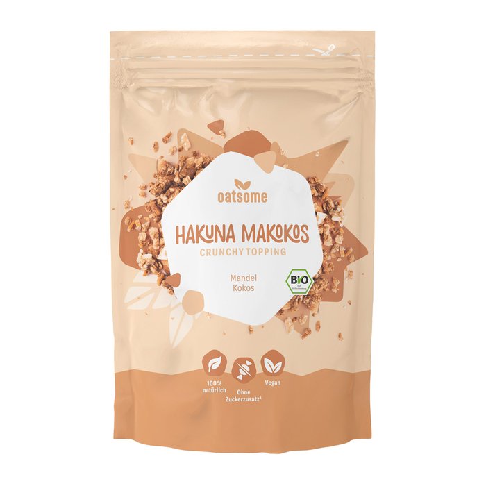 Hakuna Makokos - dieses Topping mögen wir gern! Durch den enthaltenen Crunch aus Kokoschips, Mandeln und Hafer wird Hakuna Makokos zum König der Toppings. 100% natürliche Bio-Zutaten und der Verzicht auf zugesetzten Zucker1 machen aus unserem Hakuna Makokos Crunchy Topping ein mineralstoffreiche Ergänzung für deine Smoothie Bowl.
