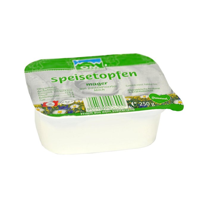 Der OM Magertopfen 0 % ist fettfrei und schmeckt besonders leicht. Er eignet sich als Grundlage für Brotaufstriche oder kommt bei Kuchenrezepten zum Einsatz.