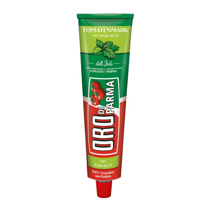 Zutaten: Tomatenmark 2-fach konzentriert, Basilikum (2,5 %), Salz, natürliches Basilikum-Aroma.
