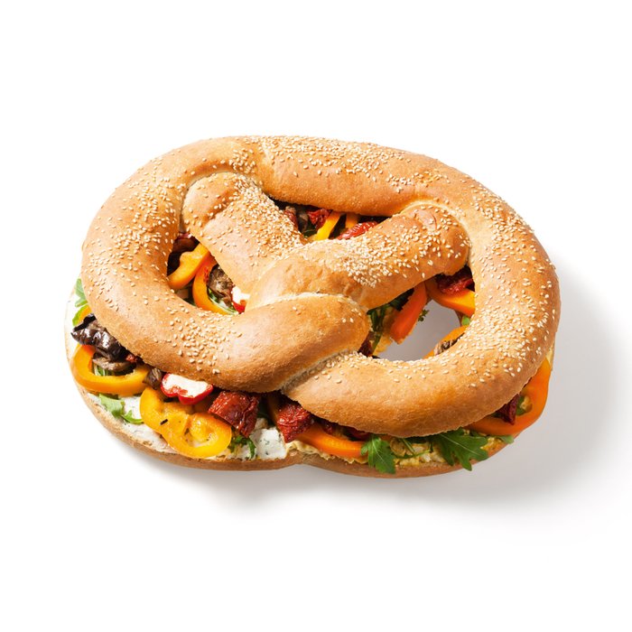 Zutaten Brezel: WEIZENMEHL, Wasser, ROGGENMEHL, SESAM, Margarine (Palmfett, Rapsöl, Wasser, Speisesalz unjodiert), Speisesalz unjodiert, MOLKENPULVER, Backmittel (WEIZENMALZMEHL, WEIZENFASERN, Emulgator: E471, Zucker), Hefe;