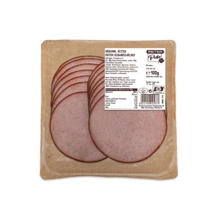 Zutaten: Für 100g Puten-Schwarzwälder werden 105g Putenfleisch verwendet. Putenfleisch, Speisesalz, Gewürze, Gewürzextrakte, Würze, Dextrose, Stabilisator:E450, Geschmacksverstärker:E621, Antioxidationsmittel:E301, Konservierungsstoff:E250, Rauch.