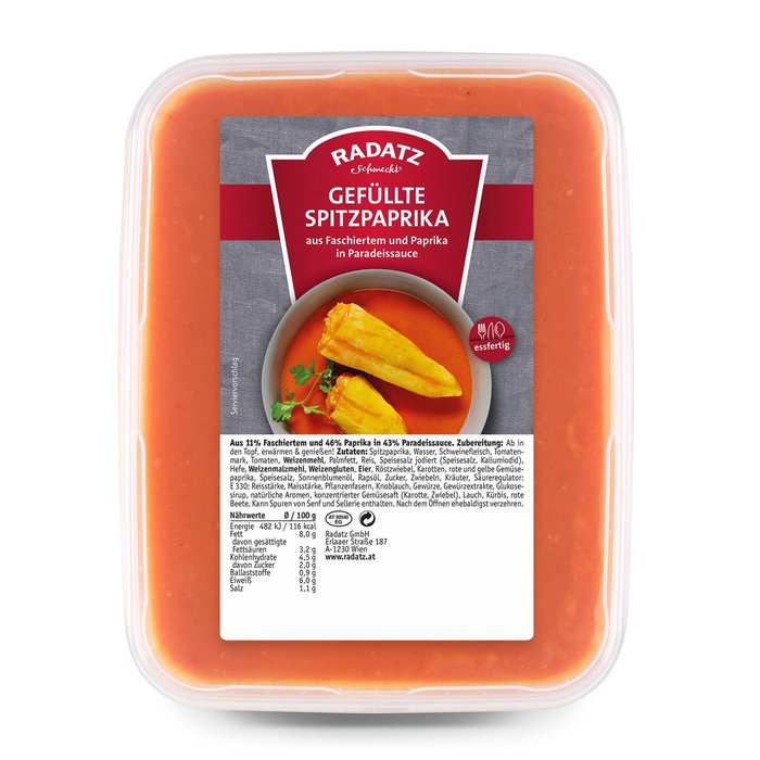 Gefüllte Spitzpaprika aus 11% Faschiertem und 46% Paprika in 43% Paradeissauce.