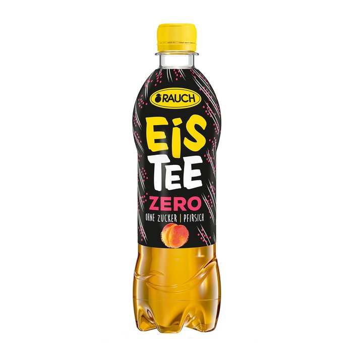 Eistee mit Pfirsichgeschmack aus Schwarztee und Hagebutte mit Süßungsmitteln. Zuckerfrei.