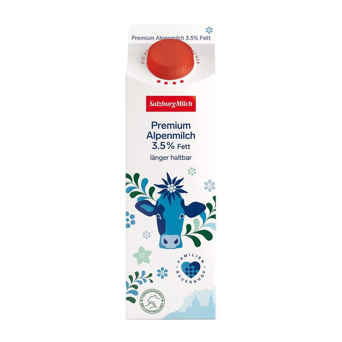 Premium Alpenmilch steht für exzellenten Geschmack bei jedem Schluck. Ob pur im Glas oder zu Speisen verarbeitet, die 3,5 % Fett sorgen für vollmundigen Genuss.