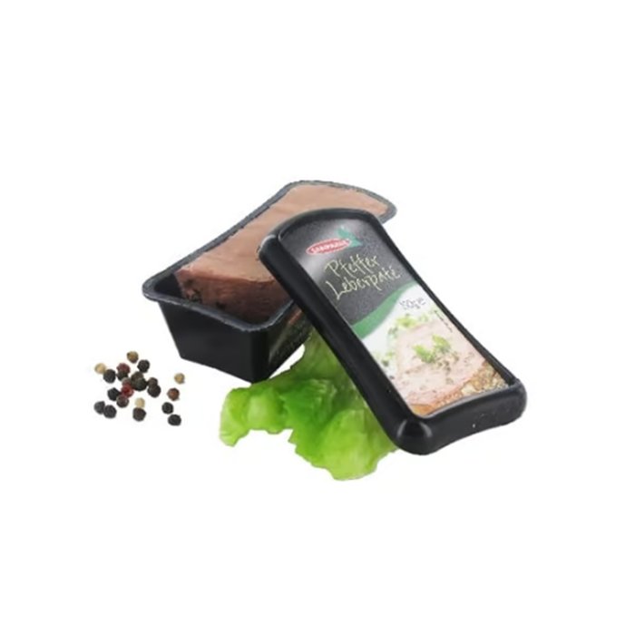 Zutaten: Schweineleber (32%), Speck , Brühe (Trinkwasser, Schweinespeck), grüner Pfeffer (2,5%), Salz, Kartoffelstärke, Zucker, Zwiebeln, Gewürze, MILCHPULVER, Dextrose, Glukosesirup, Geliermittel: E412, Erbsenprotein, Tomatenpulver, Aroma, Antioxidationsmittel: E316, KonservierungsstoffE250.