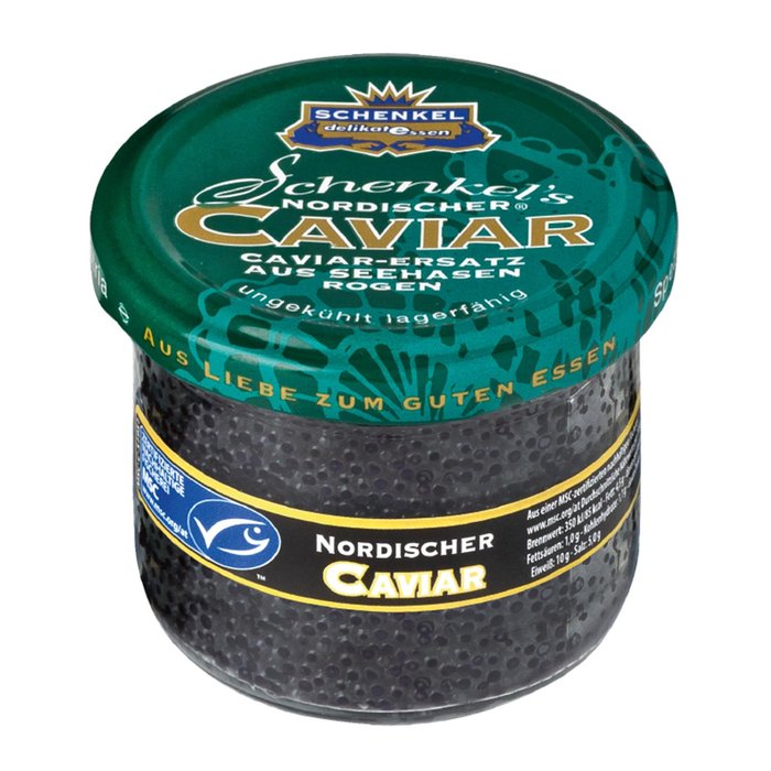 Zutaten: SEEHASENROGEN**(Cyclopterus lumpus), Speisesalz, Konservierungsstoff: E211, Farbstoffe: E150d, E151, E110*, Säuerungsmittel: E330. **Gefangen im Nordostatlantik (FAO 27) mit Umschließungsnetzen. Unterbereich Va2.