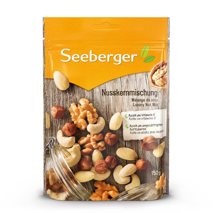 Zutaten: NUSSKERNMISCHUNG in veränderlichen Gewichtsanteilen (HASELNUSSKERNE, blanchierte MANDELN, CASHEWKERNE), WALNUSSKERNE (10 %).