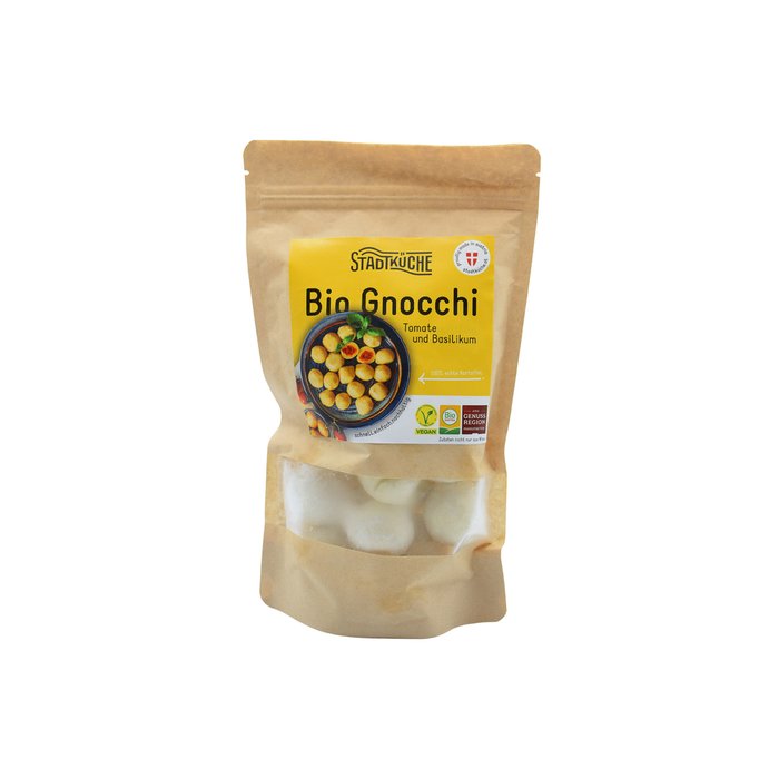 Stadtküche & Kasnudl GmbH** steht für hochwertigste Bio-Produkte aus Österreich, mit Liebe gefertigt in unserer Manufaktur in Wien. Unsere **BIO Gnocchi Tomate & Basilikum** bestehen aus frischem Kartoffelteig, der aus besten österreichischen Erdäpfeln hergestellt wird. Die Füllung aus sonnengereiften Tomaten und einem Hauch Basilikum macht diese veganen Gnocchi zu einem unvergleichlichen Genuss. Egal ob gekocht in Sauce oder knusprig angebraten - ein Geschmackserlebnis der besonderen Art!
