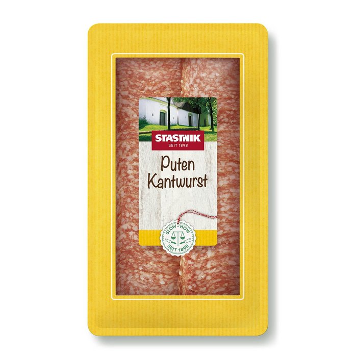 Die köstliche Stastnik Putenkantwurst überzeugt durch ihren fein würzigen Geschmack und ist durch ihre charakteristische eckige Form unverwechselbar. Die milde Buchenholzräucherung, sowie der kontrollierte Reifungsprozess von 3 bis 6 Wochen, prägen den unvergleichlichen Geschmack.