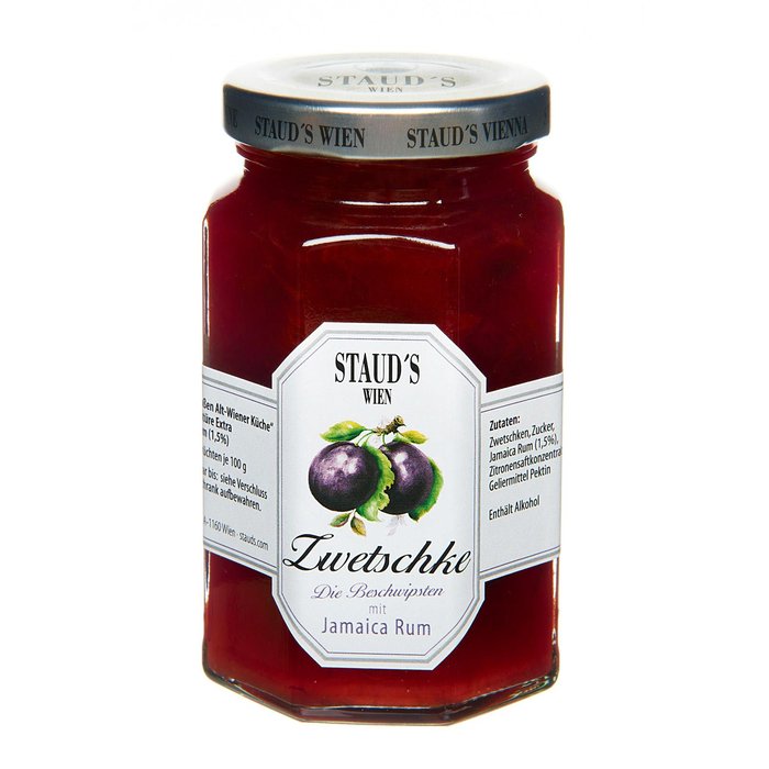 Zutaten: Zwetschken, Zucker, Jamaica-Rum (1, 5 %), Zitronensaftkonzentrat, Geliermittel Pektin. Hergestellt aus 50 g Früchten je 100 g. Enthält Alkohol.