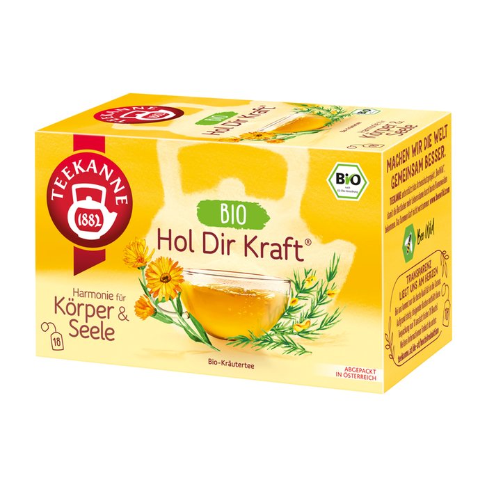 Wer kennt das nicht, wenn man sich mal kurz ausklinken muss, um wieder aufzutanken. In dieser Pause ist eine Tasse TEEKANNE Hol Dir Kraft ein Genuss. Ein süßlich feiner Geschmack von Honigbusch ist die Basis dieses Kräutertees mit Ringelblumenblüten. Erlebe den puren Genuss aus natürlichen Zutaten - in Bio-Qualität. Harmonie für Körper & Seele - unsere Wohlgenuss-Tees.