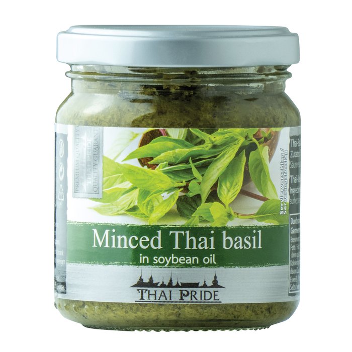 Zutaten: Thai-Basilikum 85%, SOJABOHNENÖL 8%, Zucker, Säureregulator: Citronensäure.