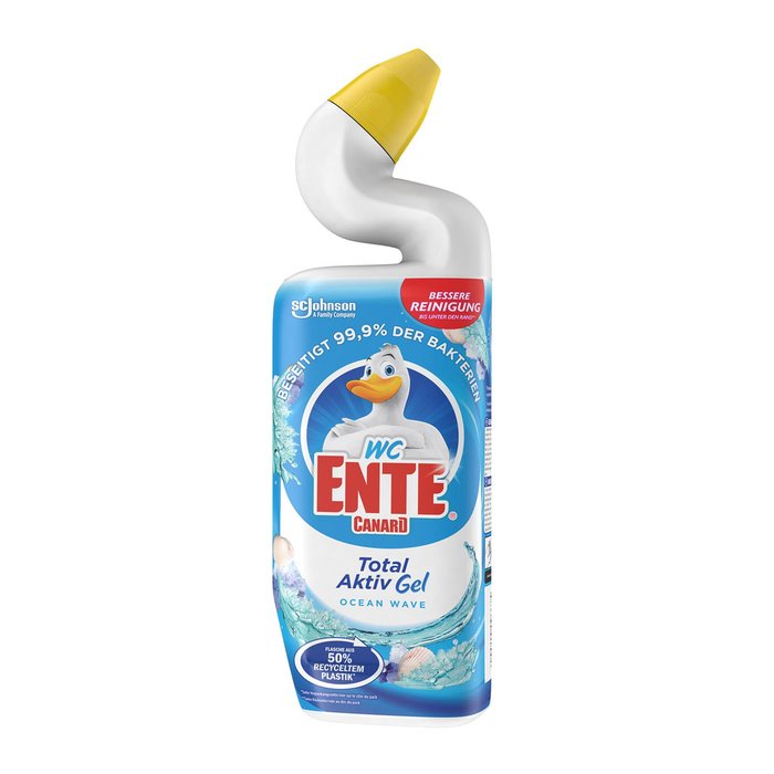 Außer Reichweite von Kindern aufbewahren. 1. Toilettensitz hochklappen. 2. Verschluss der Flasche an den markierten Stellen zusammendrücken und durch gleichzeitiges Drehen öffnen. Flasche kippen, um den Entenhals mit Reiniger zu füllen. 3. Einfach WC-Ente Gel so unter den Rand spritzen, dass die Oberfläche gleichmäßig mit Reiniger benetzt wird. 4. Für die Reinigung und das Entfernen von Gerüchen 5 Minuten einwirken lassen. Zur Entfernung von hartnäckigen Verschmutzungen 60 Minuten oder über Nacht einwirken lassen. Über und unter der Wasseroberfläche bürsten, dann spülen. 5. Nach Gebrauch Verschluss hörbar einrasten lassen.