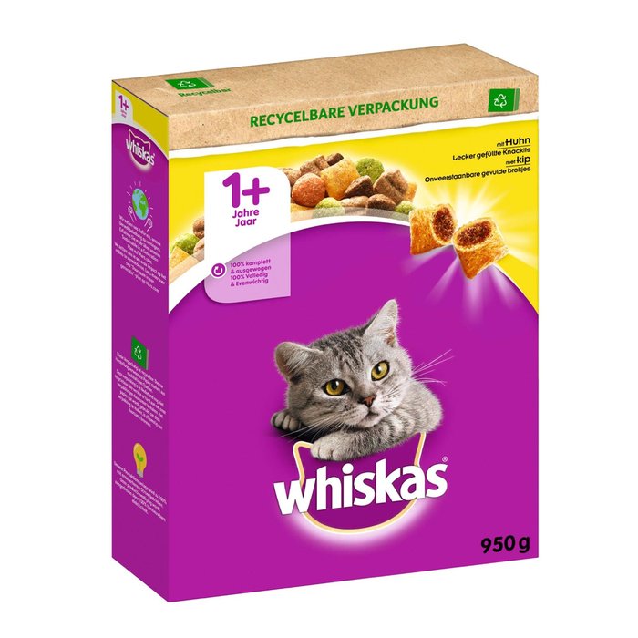 Fütterungsempfehlung: Wir empfehlen eine Mischung aus WHISKAS® Trocken- und Feuchtnahrung zu füttern. Bei übergewichtigen Katzen reduzieren Sie bitte die tägliche Fütterungsmenge. Nehmen Sie sich Zeit für die Fütterungsumstellung, passen Sie die Fütterungsmenge an und teilen Sie diese in mehrere Mahlzeiten, entsprechend den Bedürfnissen Ihres Tieres. Für Fütterungsinformationen besuchen Sie unsere Webseite oder rufen Sie unsere Service-Hotline an. Stellen Sie frisches Trinkwasser bereit. Bitte geschlossen an einem kühlen und trockenen Ort lagern. Die Futtermenge für Ihr Tier variiert je nach Alter, Gewicht, Rasse, Geschlecht und Aktivitätsgrad. Weil es wichtig ist, dass Ihr Haustier die richtige Futtermenge bekommt, schauen Sie bitte auf der Packung die detaillierten Fütterungsempfehlungen an.