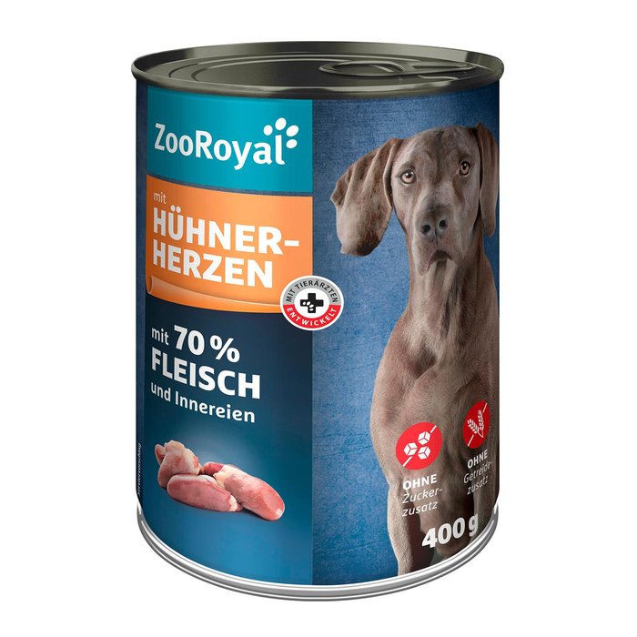 Zusammensetzung: Fleisch- und tierische Nebenerzeugnisse 70% (20% Hühnerherzen), Mineralstoffe 1%.