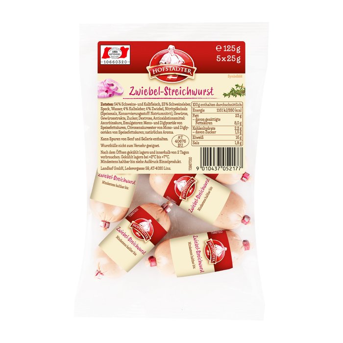Zutaten: 54% Schweine- und Kalbfleisch, 23% Schweineleber, Speck, Wasser, 4% Kalbsleber, 4% Zwiebel, Nitritpökelsalz (Speisesalz, Konservierungsstoff: Natriumnitrit), Gewürze, Gewürzextrakte, Zucker, Dextrose, Antioxidationsmittel: Ascorbinsäure; Emulgator: Mono- und Diglyceride von Speisefettsäuren, Citronensäureester von Mono- und Diglyceriden von Speisefettsäuren, natürliches Aroma. Kann Spuren von Senf und Sellerie enthalten. Wursthülle nicht zum Verzehr geeignet.